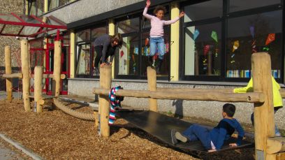 Die im Sportunterricht zuletzt immer seltener genutzte Weitsprunganlage wurde zugunsten eines modernen Seilnetzparcours aufgegeben, der die Kinder in Sachen Geschicklichkeit und Motorik nun jede Pause fordert. Dort, wo bislang noch alte Reckstangen aus den Sechziger-Jahren das Bild prägten, wurde nun eine Netzschaukel aufgestellt, deren Schaukelkorb bis zu zwölf Kinder Platz bietet. Ebenso wie eine neue Schienenbahn aus Eichenkernholz wurden auch hier die tragenden Gestelle optisch so gestaltet, als bestünden sie aus überdimensionierten Buntstiften, Linealen und Radiergummis. Darüber hinaus wurden Hopserplatten, zwei Hockeytore, eine sogenannte Slackline und eine weitere aufwendige Balancieranlage installiert.