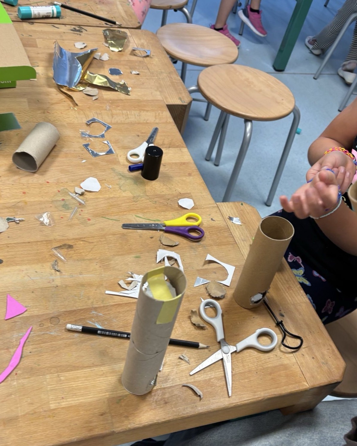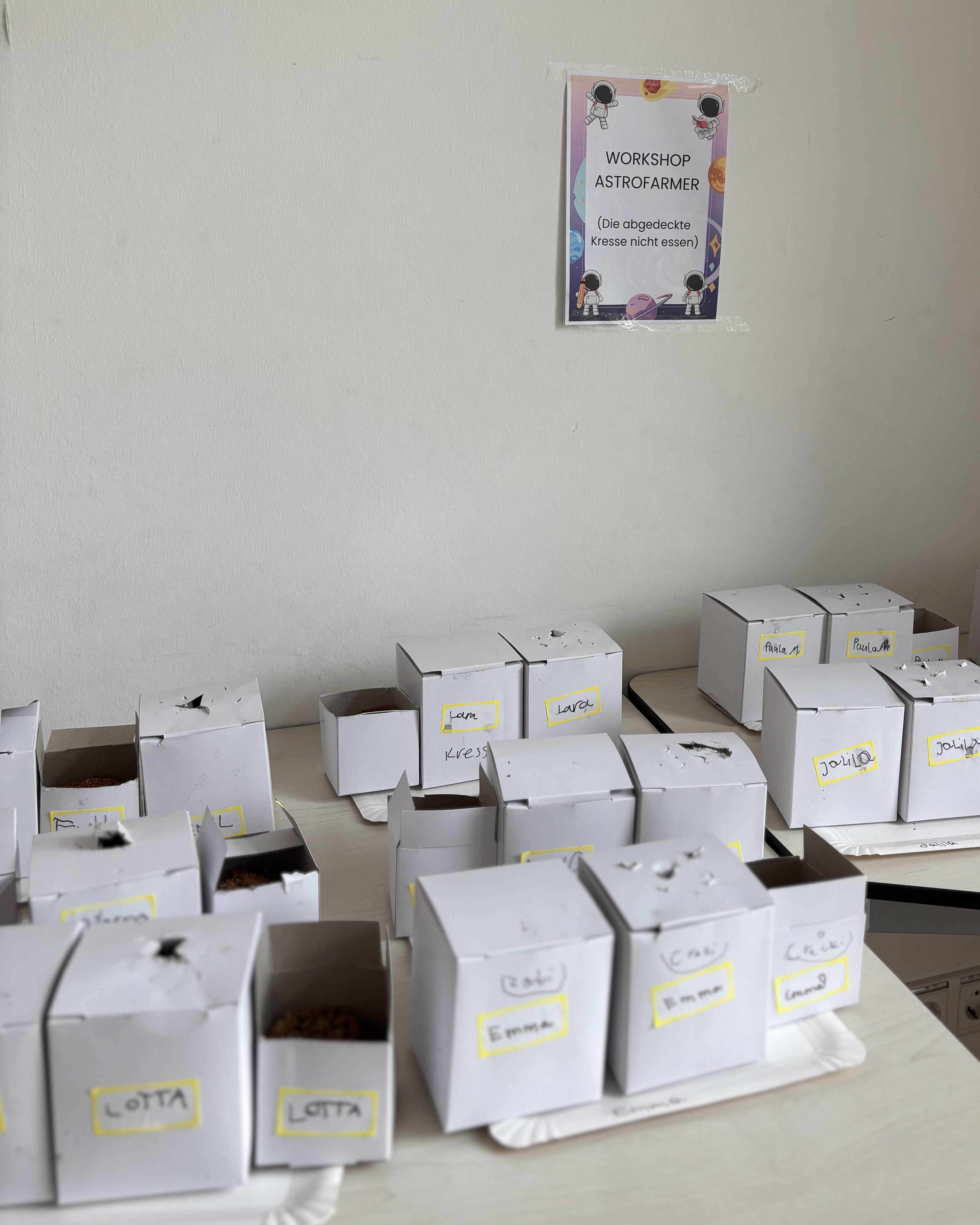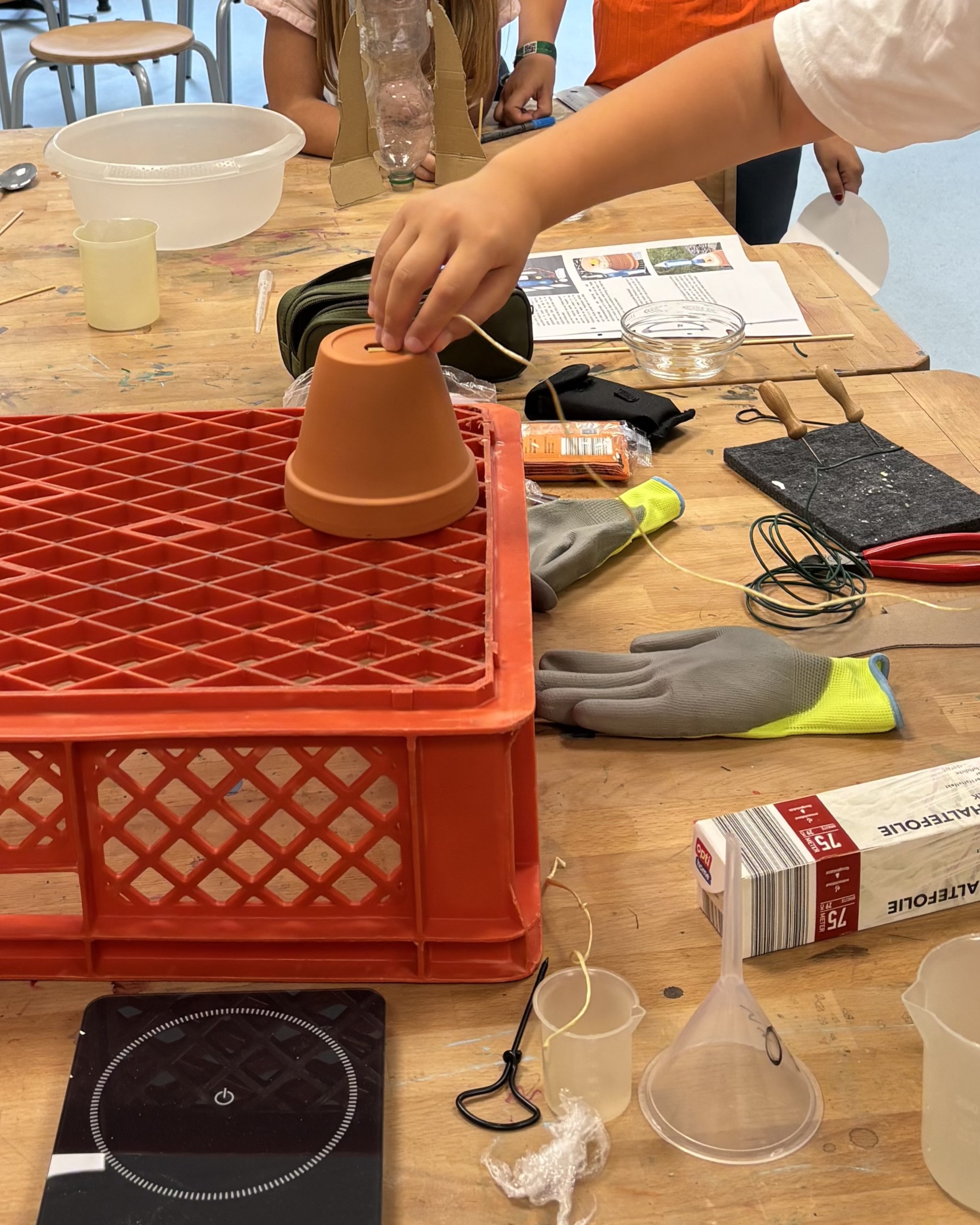 Angekommen im Weltall erforschte am Dienstag eine Gruppe, wie Pflanzen in der Schwerelosigkeit wachsen können, wenn es doch kein „oben“ und „unten“ gibt. Eine andere Gruppe beschäftigte sich mit der sicheren Landung von Raumkapseln. Hier standen kreative Lösungen und technische Überlegungen im Vordergrund. Eine weitere Gruppe baute eigene Periskope, um zu verstehen, wie sich Astronaut*innen im Raumschiff orientieren und navigieren können.