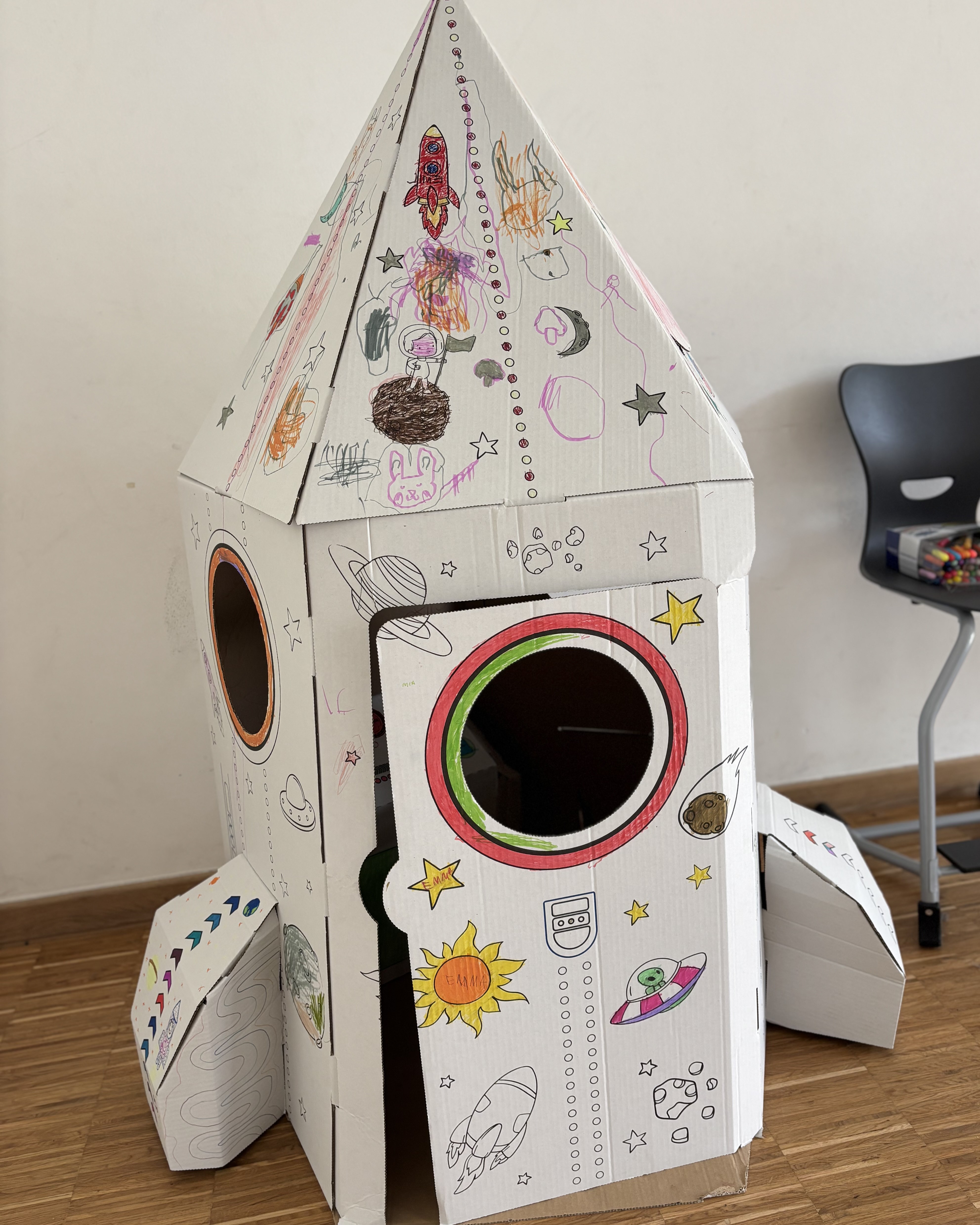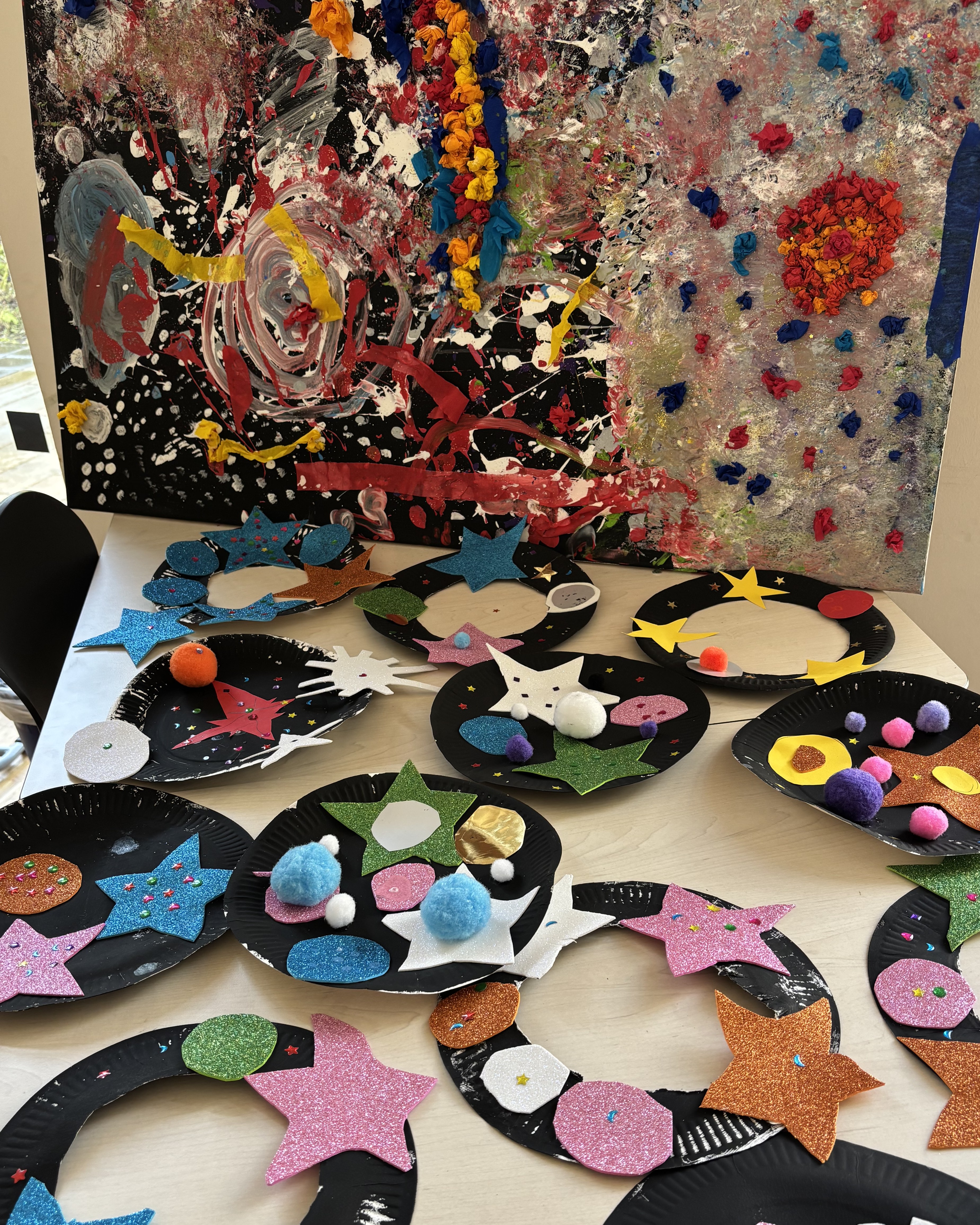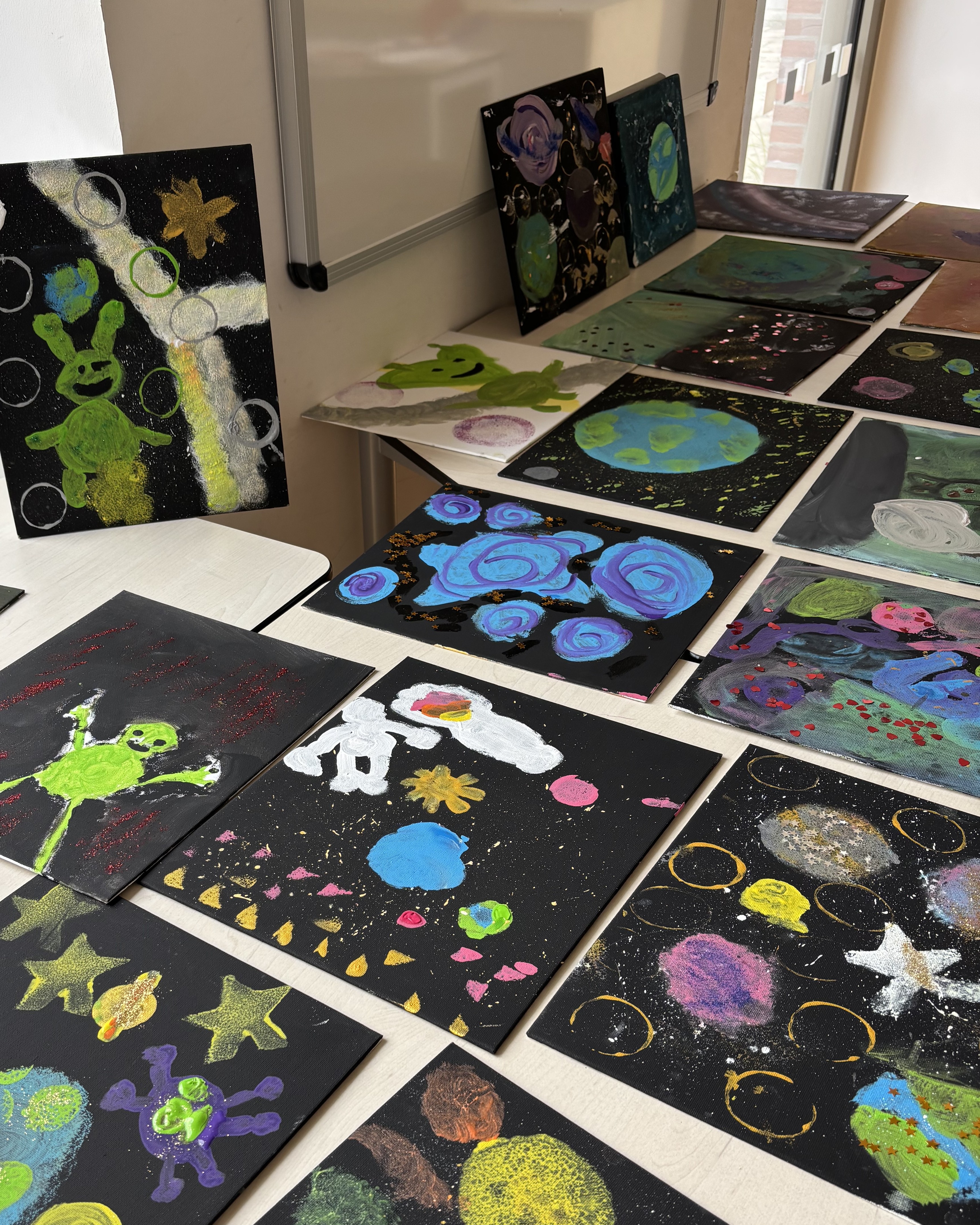 Zum Abschluss der Woche öffnete um 14:30 Uhr erneut unsere Vernissage, bei der Kinder und Eltern die kreativen Ergebnisse bestaunen konnten – von bunten Leinwänden und kleinen Weltraumlebewesen bis hin zu selbst gebauten Ufos.