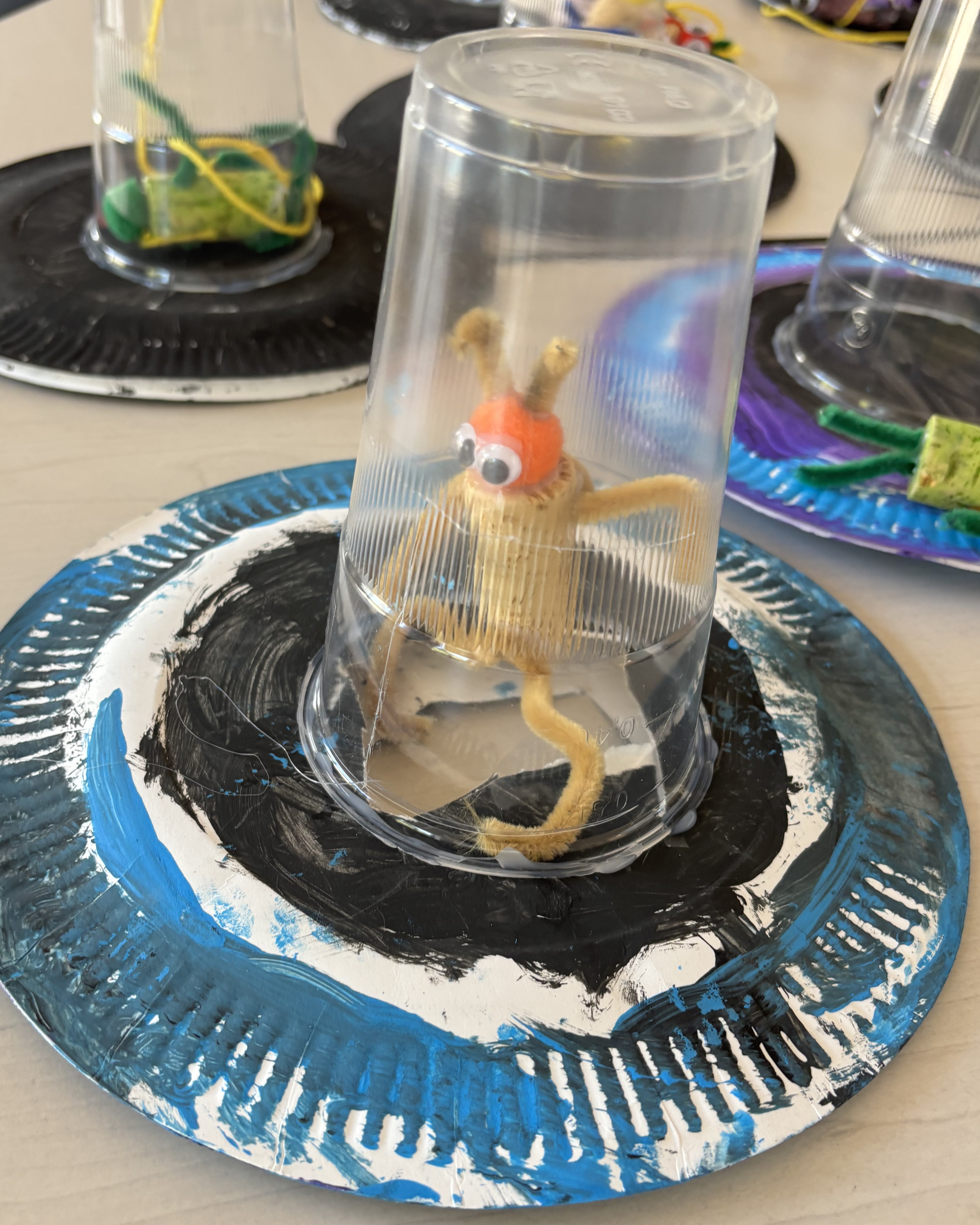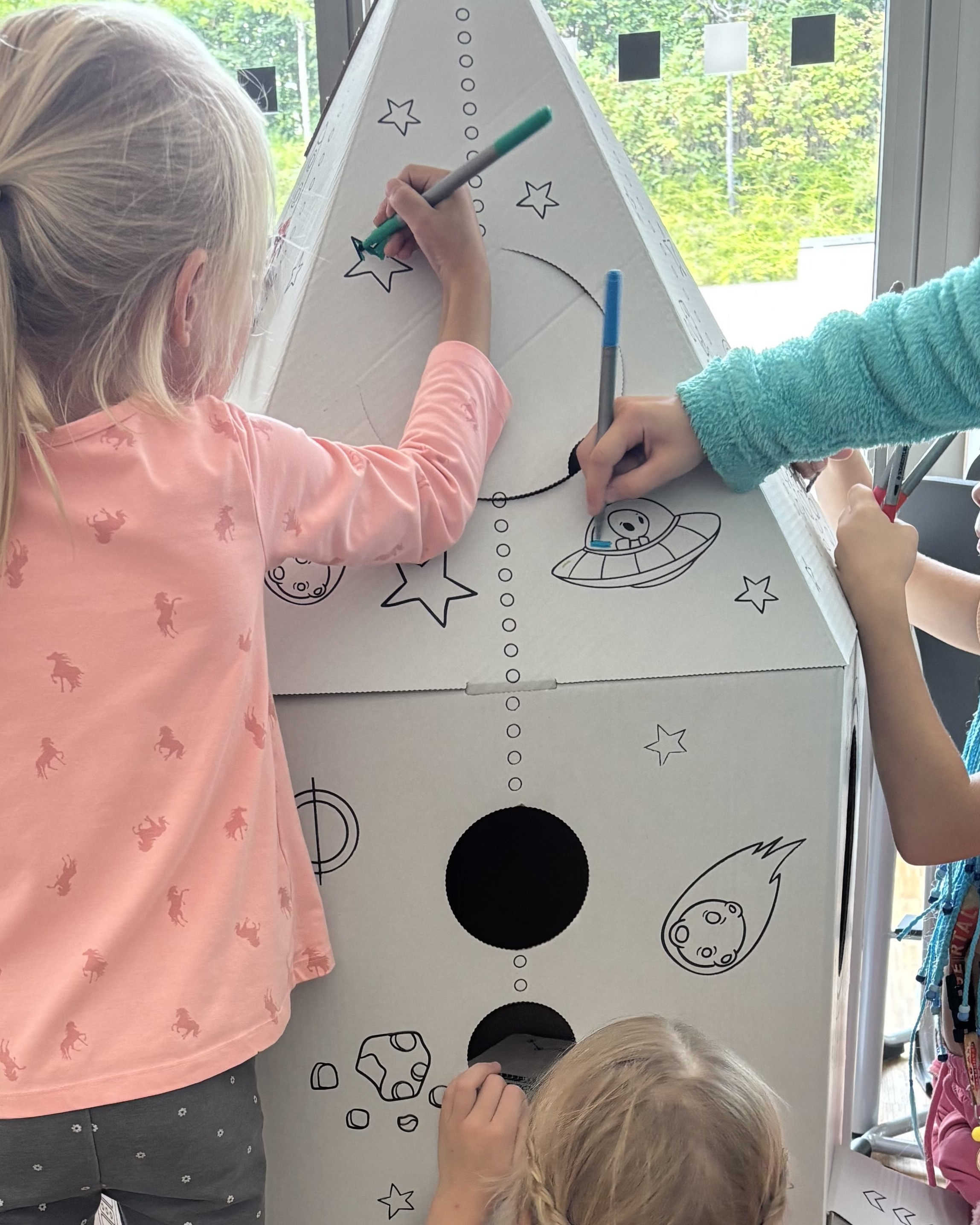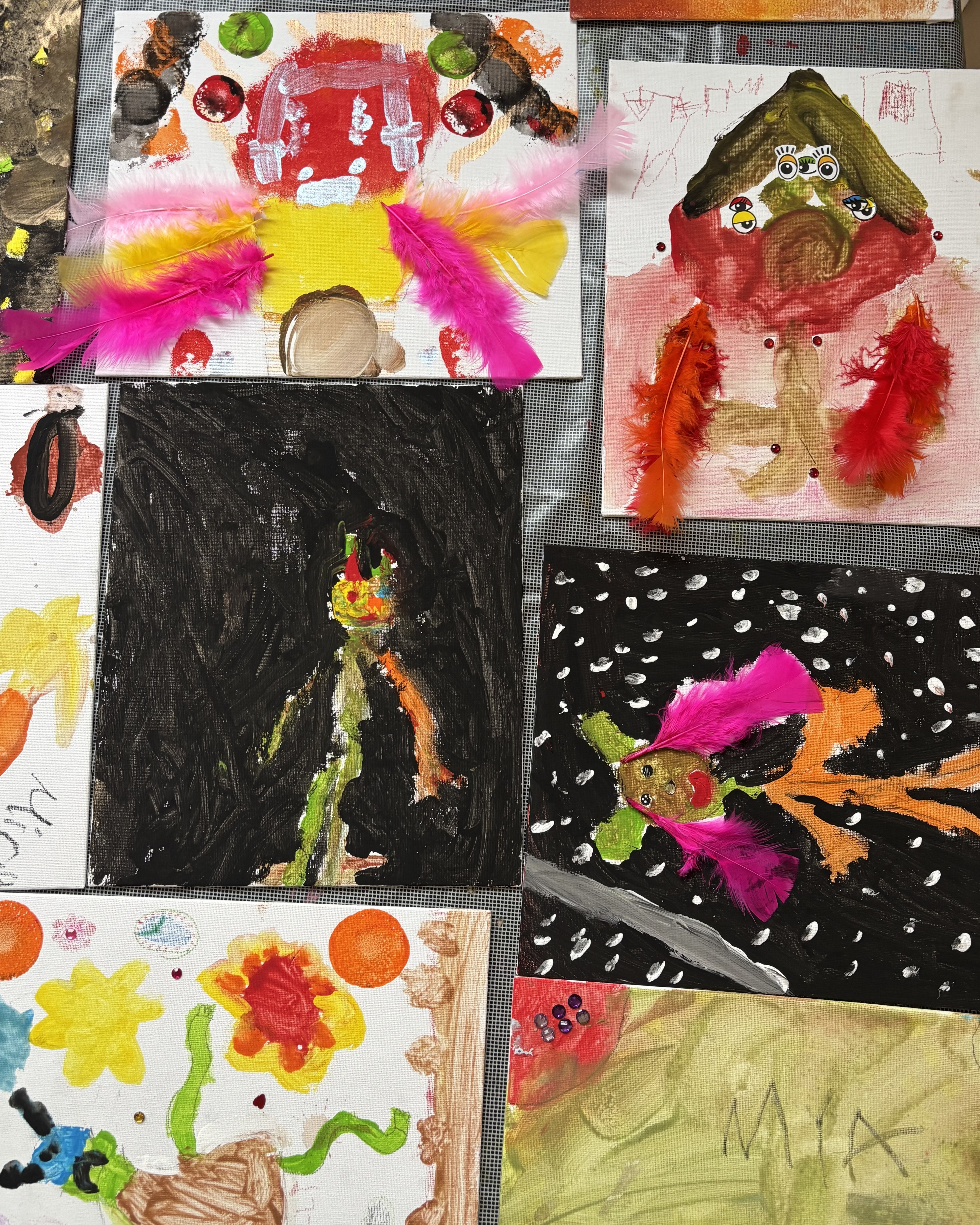 Zum Abschluss der Woche öffnete um 14:30 Uhr erneut unsere Vernissage, bei der Kinder und Eltern die kreativen Ergebnisse bestaunen konnten – von bunten Leinwänden und kleinen Weltraumlebewesen bis hin zu selbst gebauten Ufos.