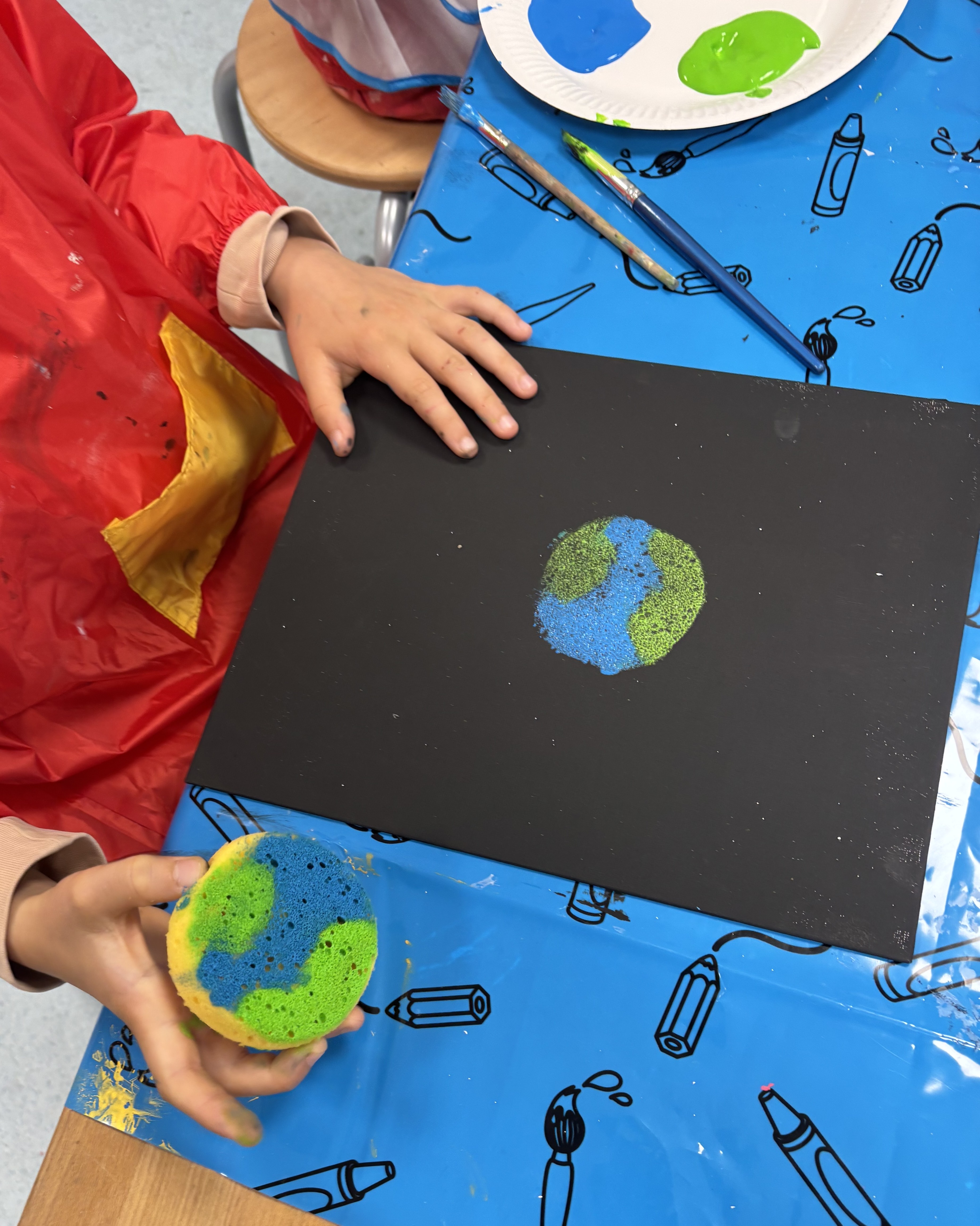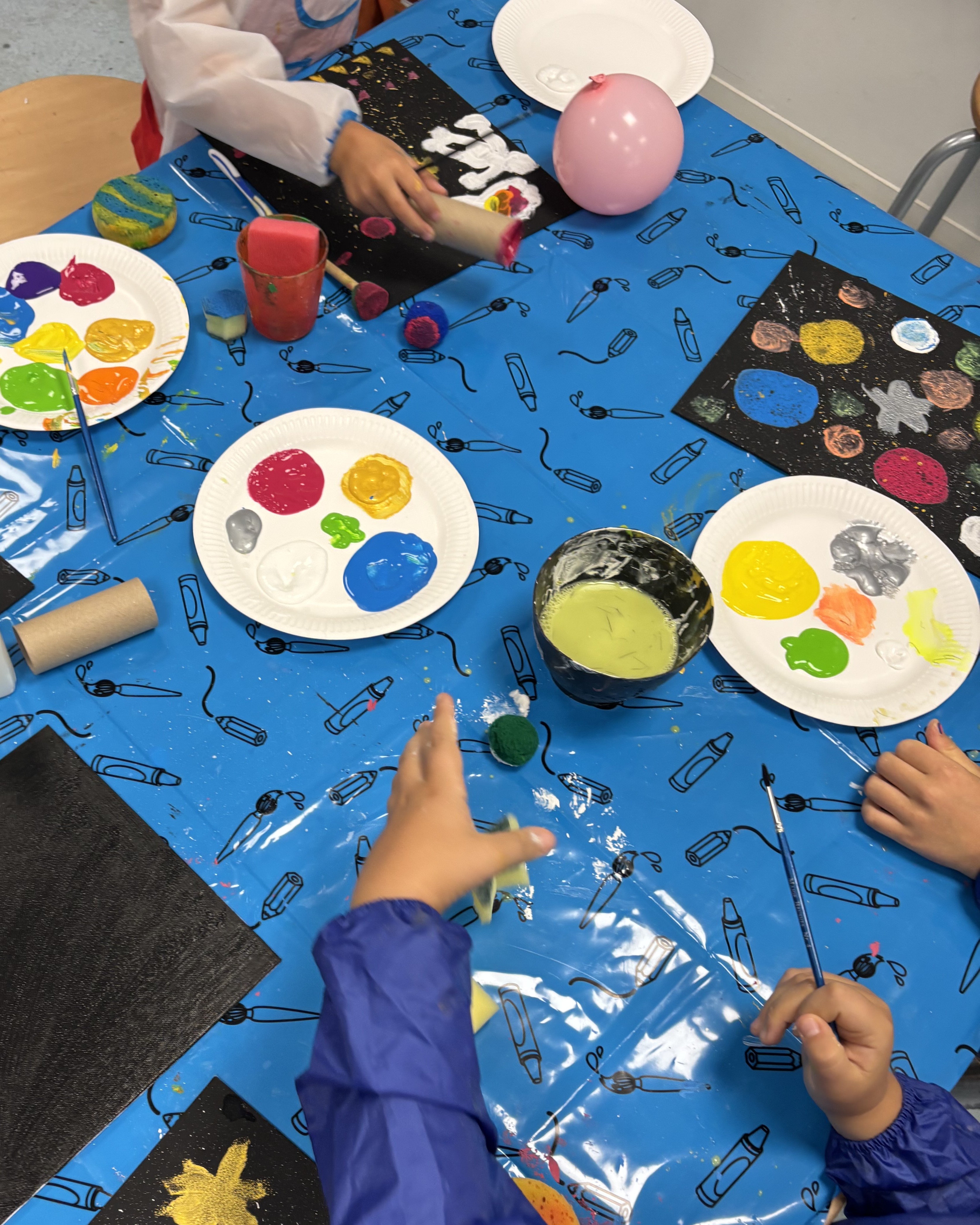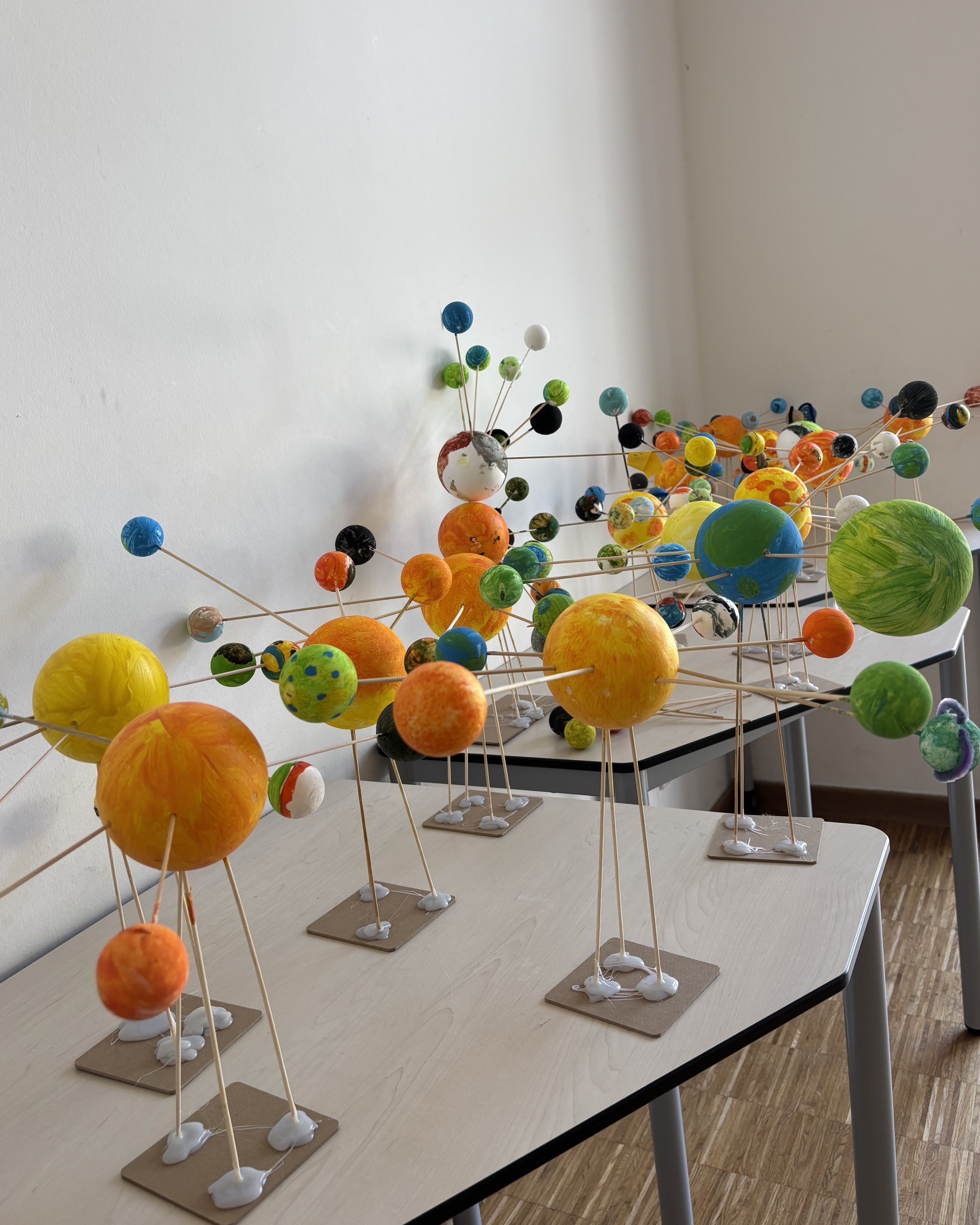In vielfältigen Workshops näherten wir uns diesen Fragen mit Neugier, Kreativität und Entdeckerfreude. Es wurde experimentiert, gebastelt, diskutiert und gestaunt – stets begleitet von Fantasie und Forschergeist. Die Kinder konnten unter anderem Leinwände gestalten, aus Modeliermasse keine Lebewesen herstellen, eigenen Planeten-Flummis gestalten, kreative Weltraum-Shirts mithilfe der Batiktechnik entwerfen und farbenfrohe Planeten-Mobiles aus Bügelperlen basteln. So entstanden kleine Kunstwerke, die ebenso individuell wie galaktisch waren.