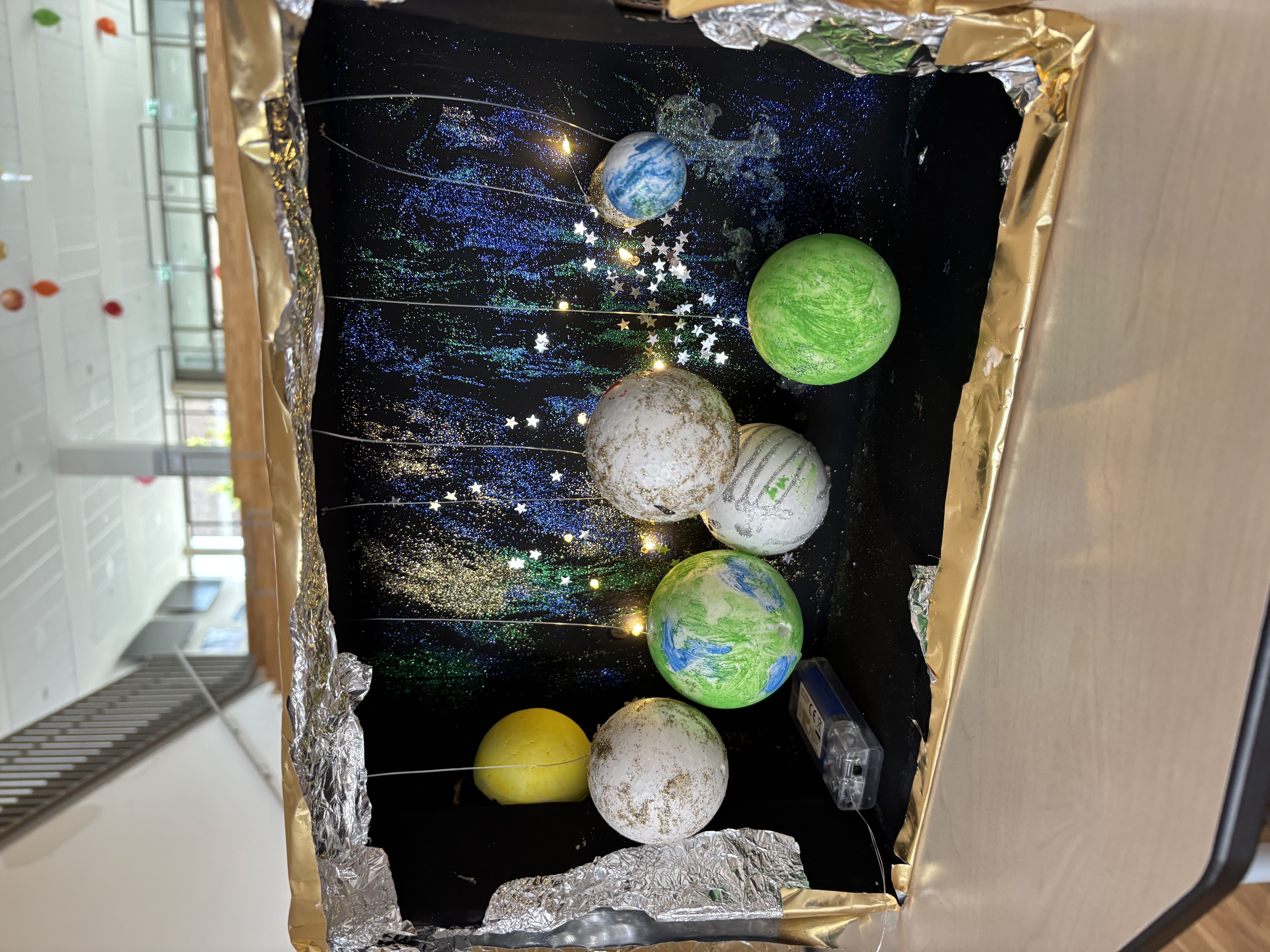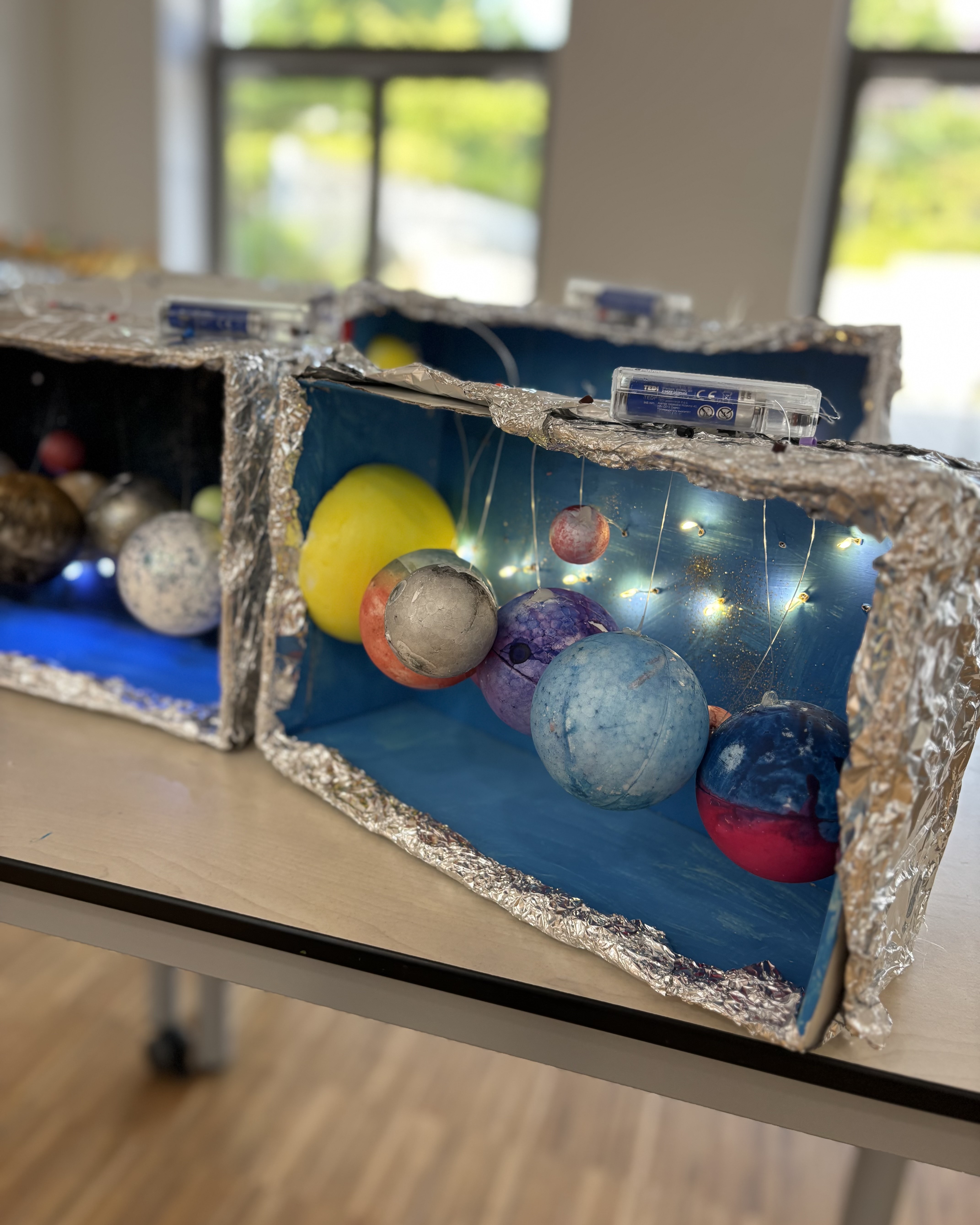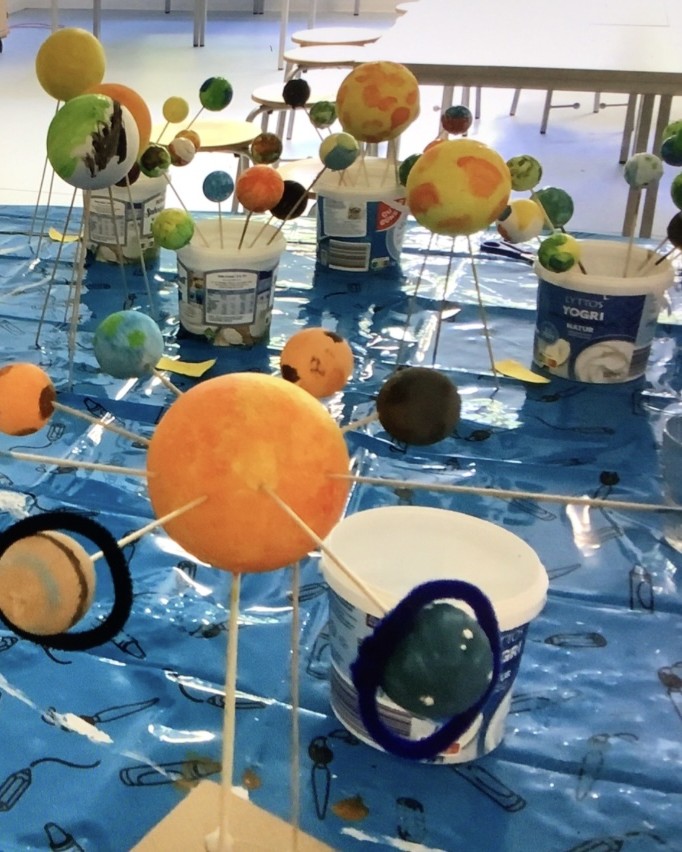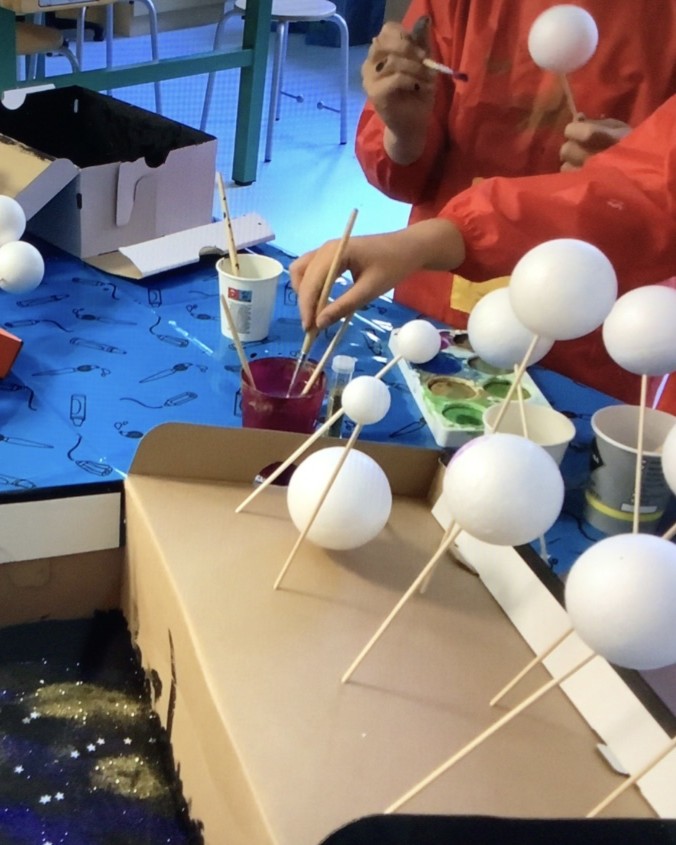 Die Woche startete mit einem großen Kreativangebot: Mit unterschiedlich großen Styroporkugeln gestalteten die Kinder ihr eigenes Sonnensystem – entweder als zusammengestecktes Modell oder im Schuhkarton als kleinen eigenen Weltraum. Wer sich lieber bewegen wollte, konnte bei actionreichen Weltraum-Spielen in der Turnhalle mitmachen.