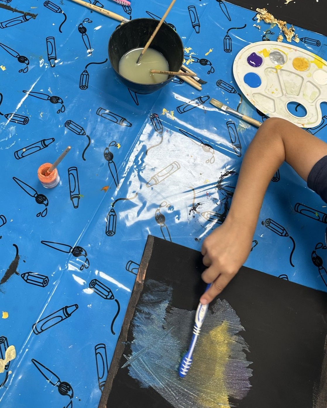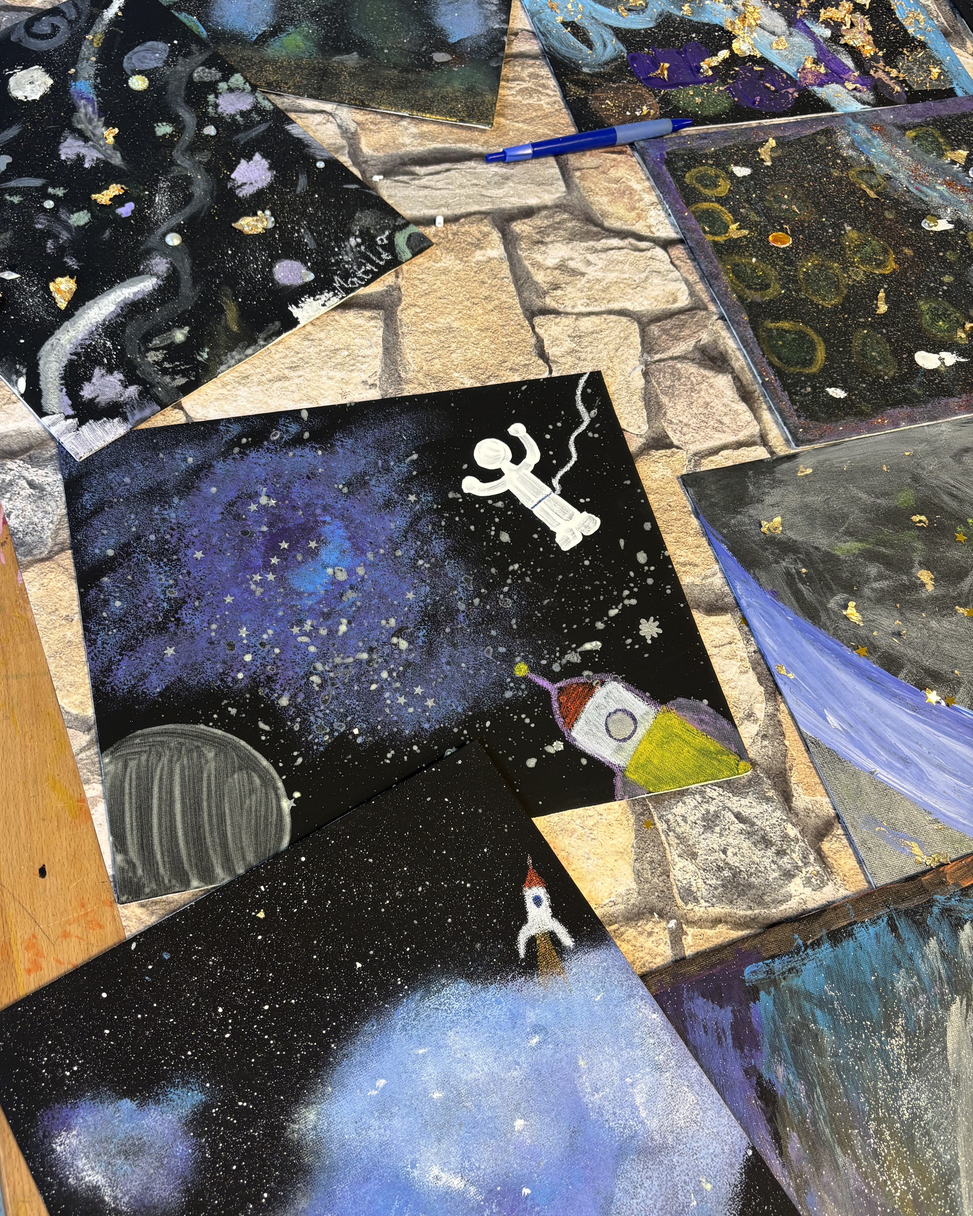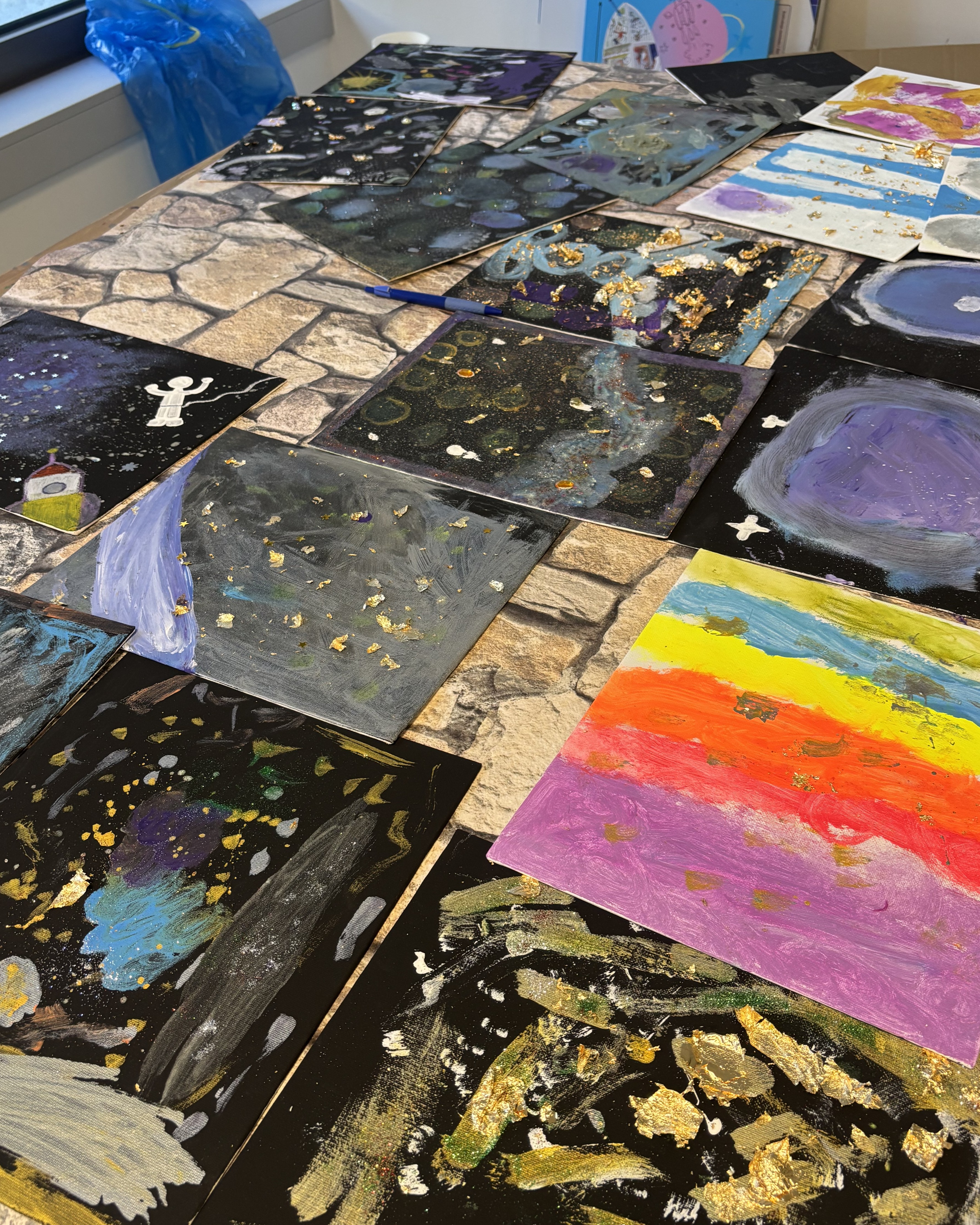 Zum Abschluss der Woche experimentierten die Kinder mit Farbverläufen – ganz im Sinne von Regenbogenfarben im Weltall – und rundeten ihre Kunstwerke ab. Ab 14:30 Uhr öffnete dann unsere kleine Vernissage, bei der Kinder und Eltern gemeinsam die vielfältigen Ergebnisse der Woche bestaunen konnten.