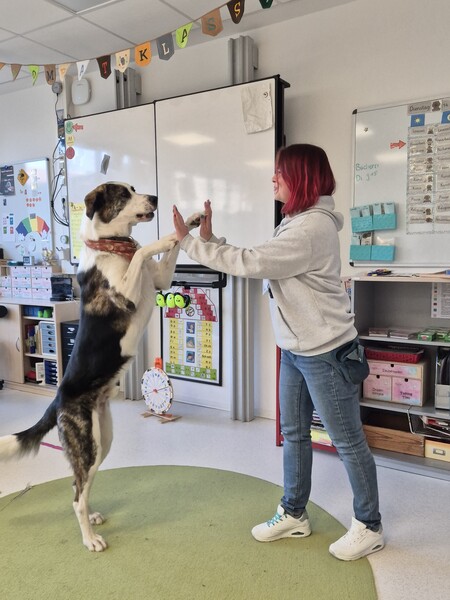 Seit dem 14.04.2026 haben wir einen neuen Schulhund! Carlos besucht regelmäßig mit Frau Kolbe die Wombatklasse (K05).
