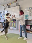 Suki lebt mit Bonni bei Frau Schulze und befindet sich in der Ausbildung zum Schulhund. Sie kommt nun regelmäßig, um das Schulgebäude, die Klasse und das neue Umfeld kennenzulernen und das korrekte Verhalten eines Schulhundes zu erlernen.